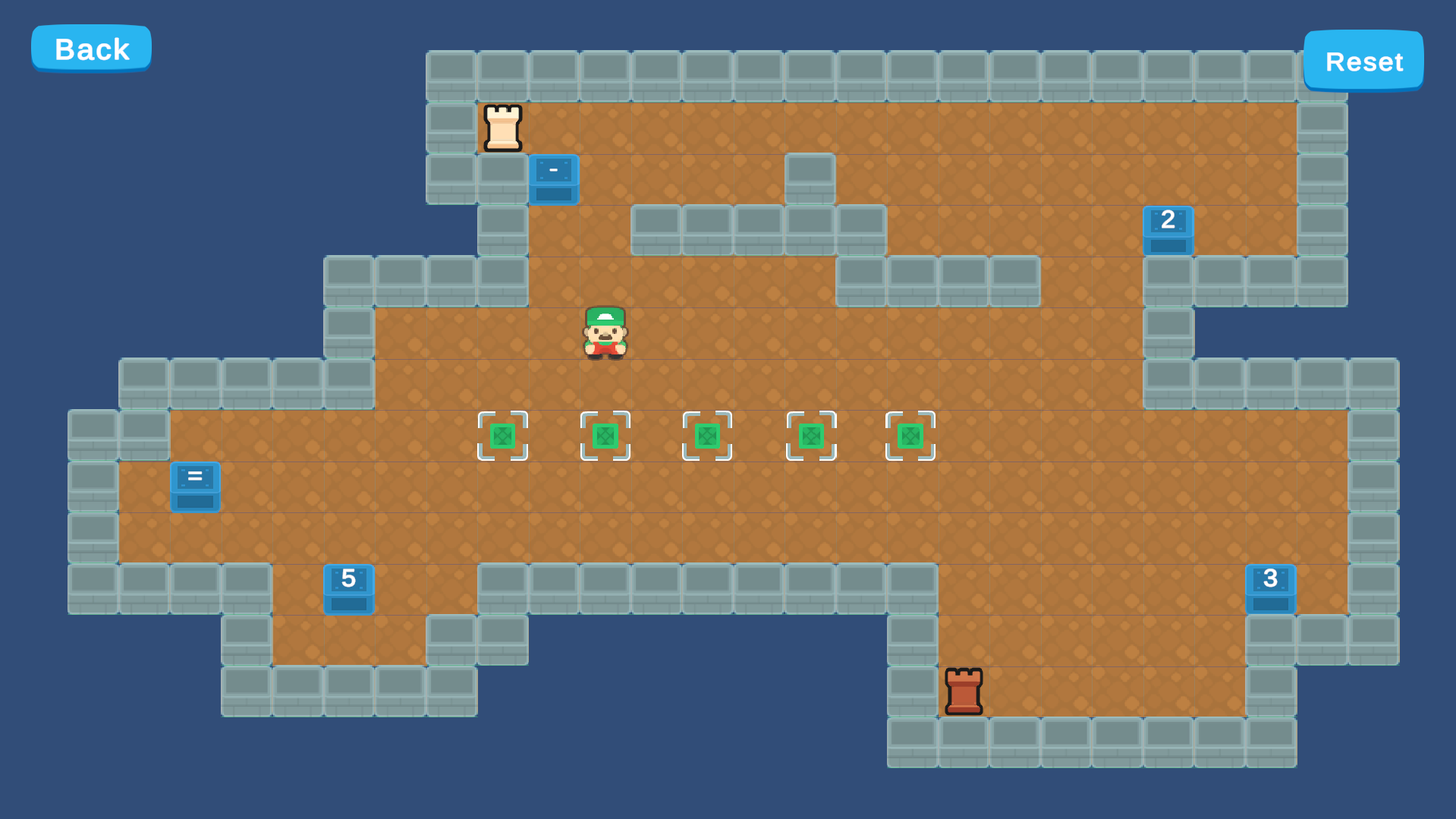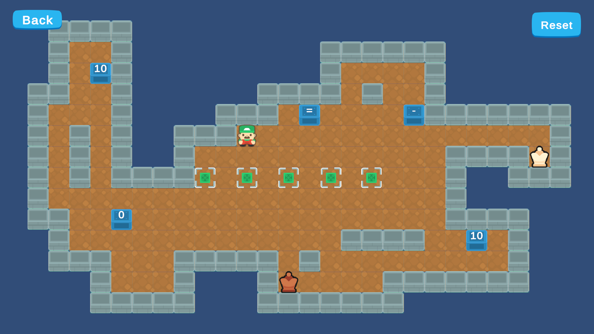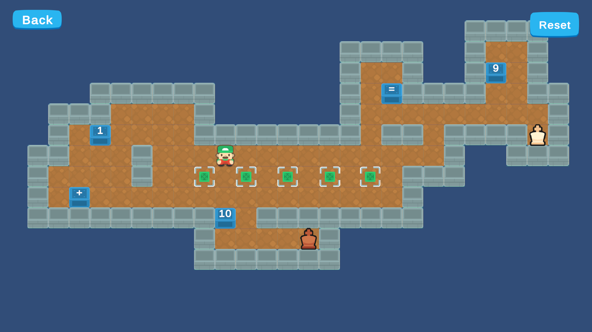 This is a math-themed puzzle game combined with Sokoban-style gameplay, where players must push boxes containing different values into designated positions to form correct mathematical equations.