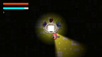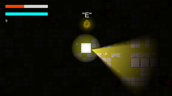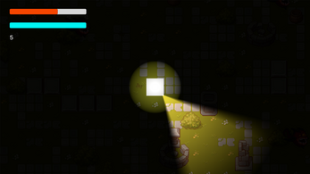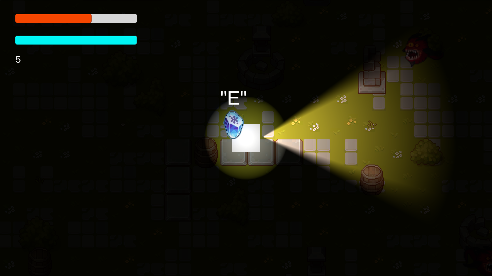 Flashlight: The flashlight follows the mouse cursor position, revealing the map and objects only within its light cone.